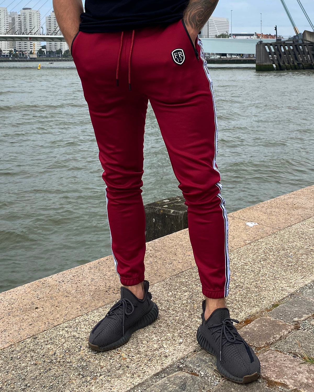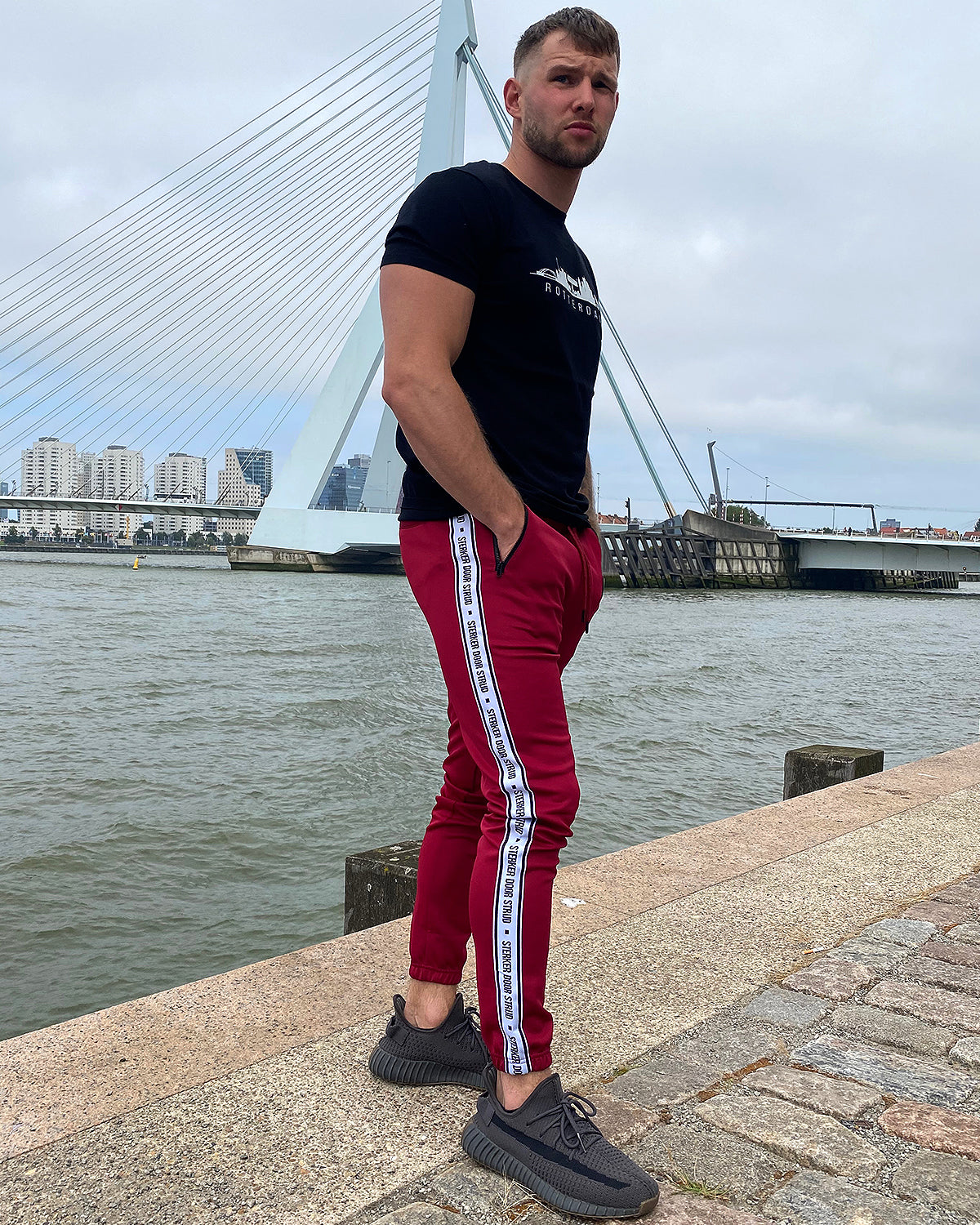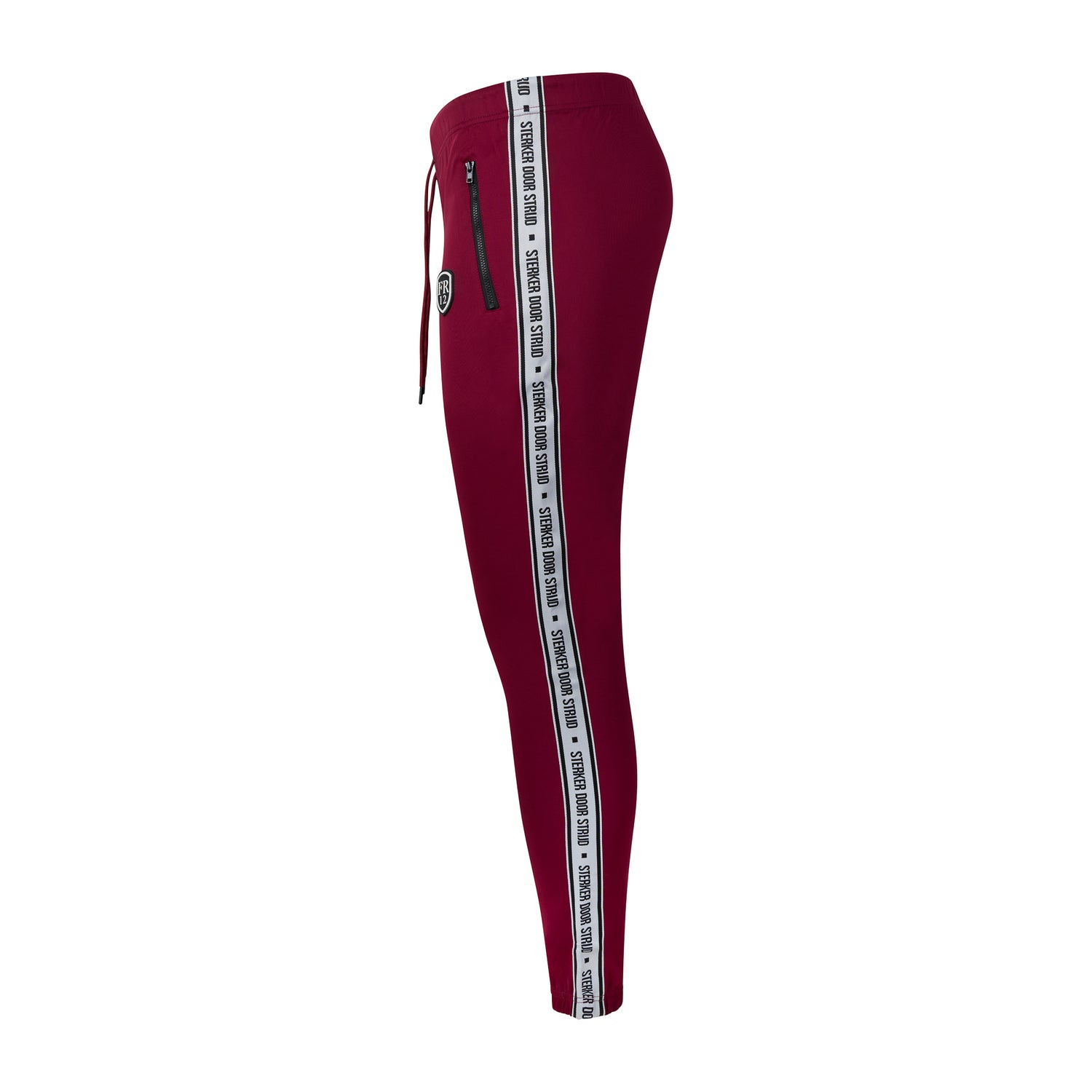 Sterker door strijd is waar Rotterdam voor staat en dat mag gezien worden. De donker rode trainingsbroek is voorzien van twee zakken met zwart afgewerkte risten. De trainingsbroek heeft een mooie sluitende pasvorm om de enkels.